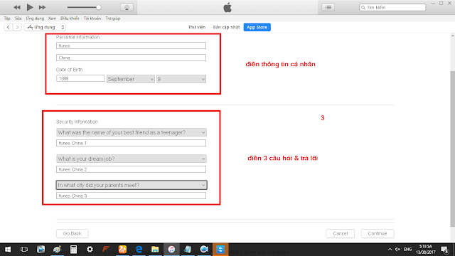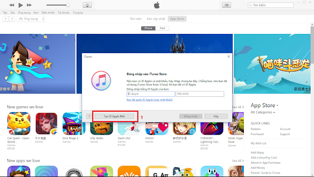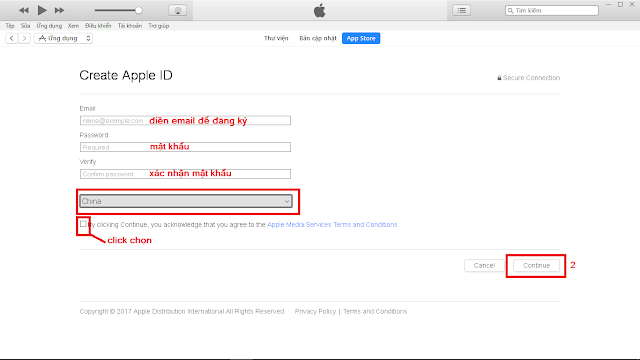 3. Sau khi cài đặt xong, tạo tài khoản theo thứ tự hình ở dưới hoặc vào link này: https://appleid.apple.com/account#!&page=create
