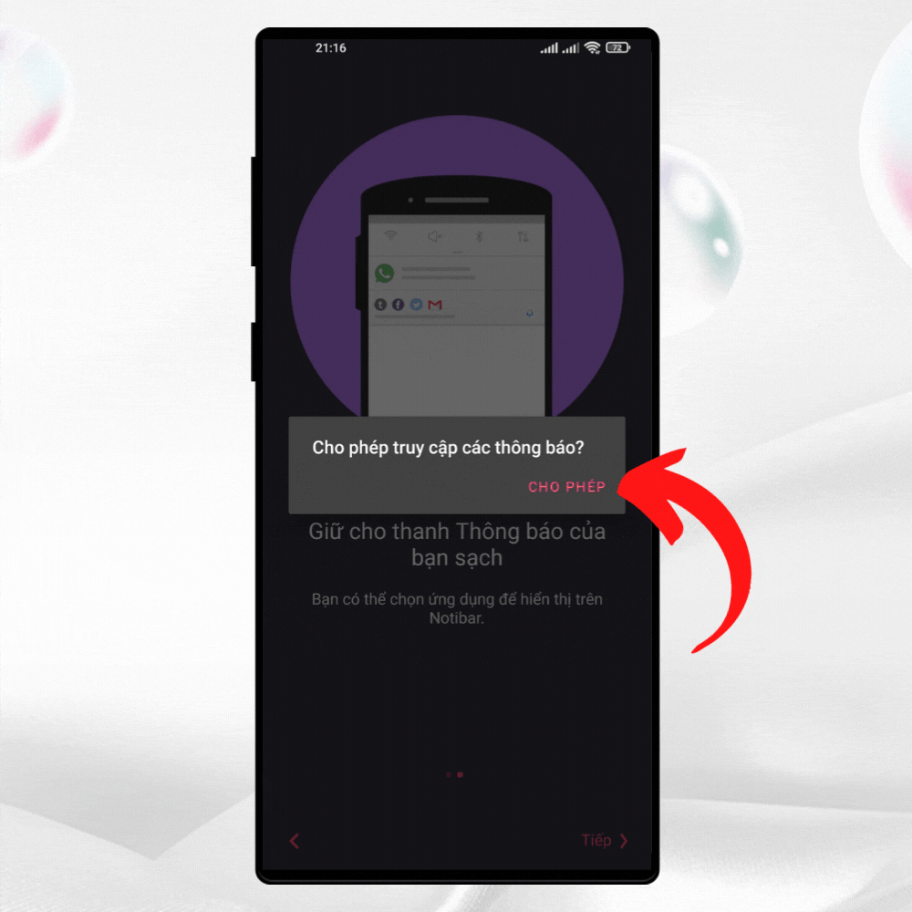 Bước 3: Vì đây là lần truy cập đầu tiên nên ứng dụng sẽ yêu cầu bạn cấp các quyền hạn cần thiết để hoạt động: Cấp quyền cho phép truy cập thông báo của các ứng dụng bằng cách nhấn nút Cho phép >> chọn ứng dụng Notisave >> gạt thanh trượt sang phải để cấp quyền.