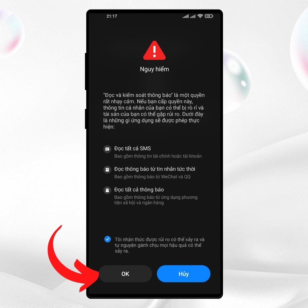 Bước 4: Ngay lúc này, một cảnh báo sẽ được gửi đến bạn về quyền đọc và kiểm soát thông báo trên các ứng dụng khác. Bạn hãy đọc kỹ và tích chọn trước cam kết cho phép và nhấn OK để tiếp tục.