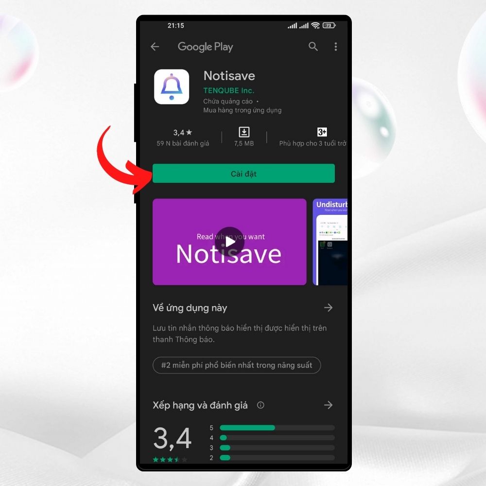 Bước 1: Bạn truy cập vào Google Play Store >> tìm ứng dụng Notisave hoặc truy cập nhanh tại đây. Tiếp theo, bạn nhấn vào nút Cài đặt để ứng dụng được tải và cài đặt vào thiết bị.